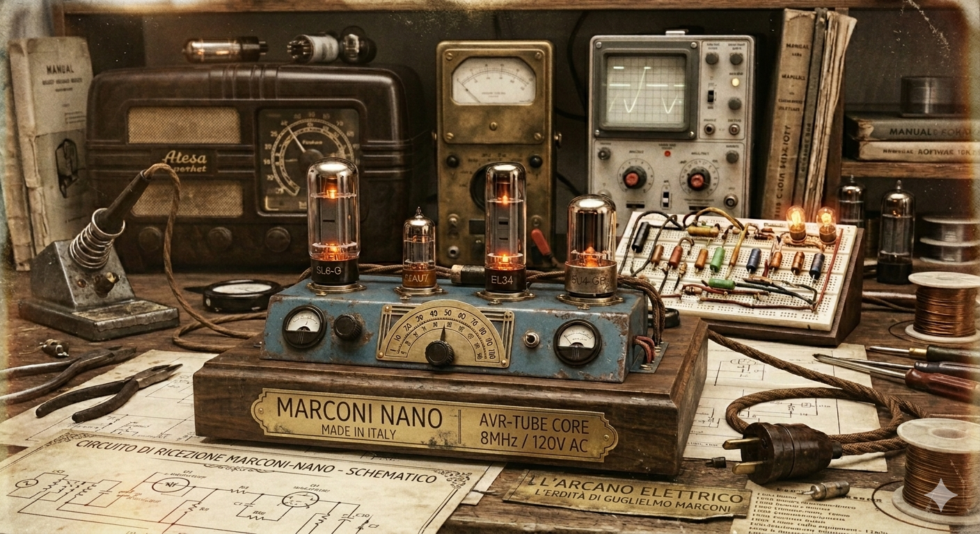 As Marconi, aboard the yacht Elettra, presses the telegraph key, the Nano emits a faint hum and the scent of ozone. The valves brighten intensely as they convert the radio signal into an electrical pulse that, traveling thousands of miles, awakens the relays at Sydney Town Hall, transforming an invisible intuition into a sea of electric light.