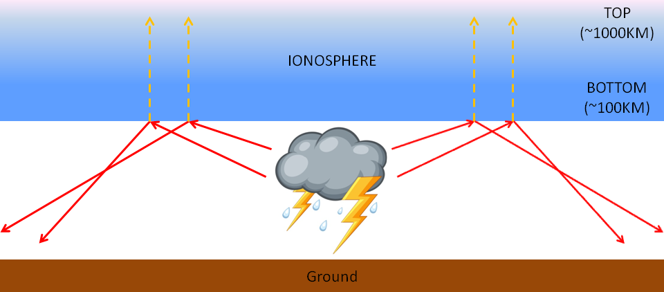 As mentioned above, the main propagation of VLF is through a system called an ionospheric waveguide. The Earth, at a distance of 60-90 km above sea level, is surrounded by a conductive layer of electrons and ions (called Layer D), which form the Ionosphere. It has the ability to reflect radio waves in the VLF band and prevent them from dispersing into space. A "channel" is thus created between the earth's surface and the ionosphere which ensures that the VLF band radio waves remain confined within this duct or waveguide. Bouncing in a zigzag between the earth's surface and the ionosphere, radio waves undergo an attenuation of approximately 2-3 dB for every 1000 km travelled, reaching distances varying from 5,000 to 20,000 km with very stable fading but high atmospheric noise due to the interference produced by electrical discharges from lightning.