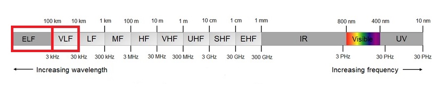VLF means Very Low Frequency that extend its range from 3 to 30 KHz, corresponding to a wavelength ranging from 100 to 10 KM. They are radio waves that propagates by ground wave or by ionospheric duct, following the curvature of the earth and are capable of diffracting around obstacles and not being reflected by them. The distances reached by these radio waves are not limited by the horizon but are in the order of thousands of km. Often in this band, we listen to radio navigation services, beacons, government radio stations, and standard frequency and time signal stations. Since VLF can also propagate in the water, they are used for military communications with submarines. The modulation used in this band are mostly digital at low transmission speed, this is due to the narrow bandwidth which makes using audio modulation unthinkable.